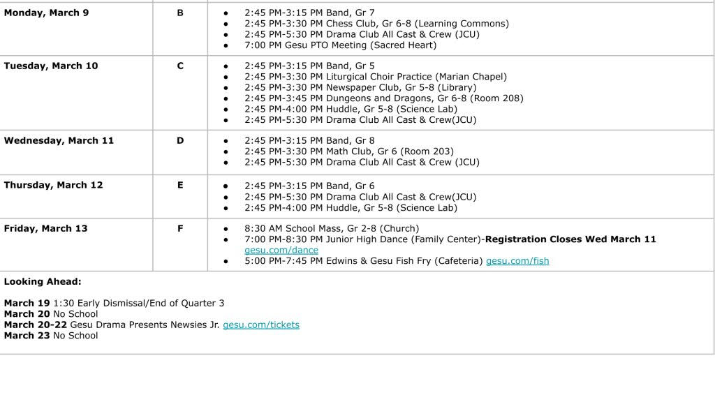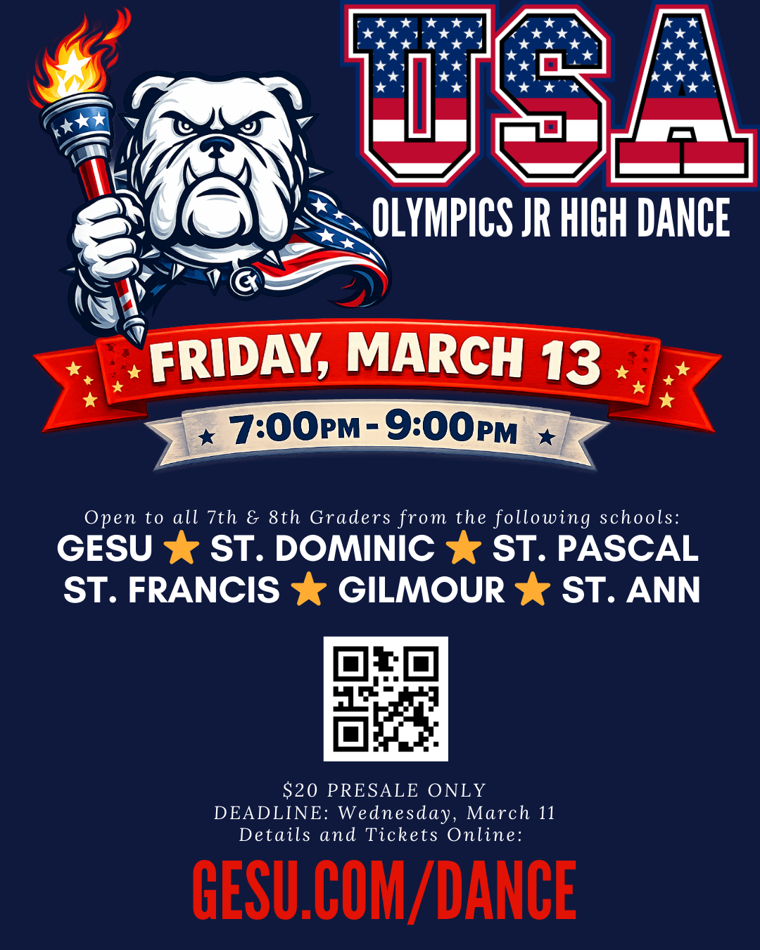 Our Junior High Dance for 7th and 8th graders will take place on Friday, March 13, 2026 from 7:00 PM–9:00 PM in the Gesu Family Center Gym This event is open to students in grades 7 and 8 from: Gesu, St. Francis, St. Dominic, St. Paschal, St. Ann, and Gilmour Schools. Cost: $20 per student. Advance registration required – ticket must be purchased before attending. Ticket sales CLOSE Wednesday, March 11 at 11:59 PM. No exceptions.
