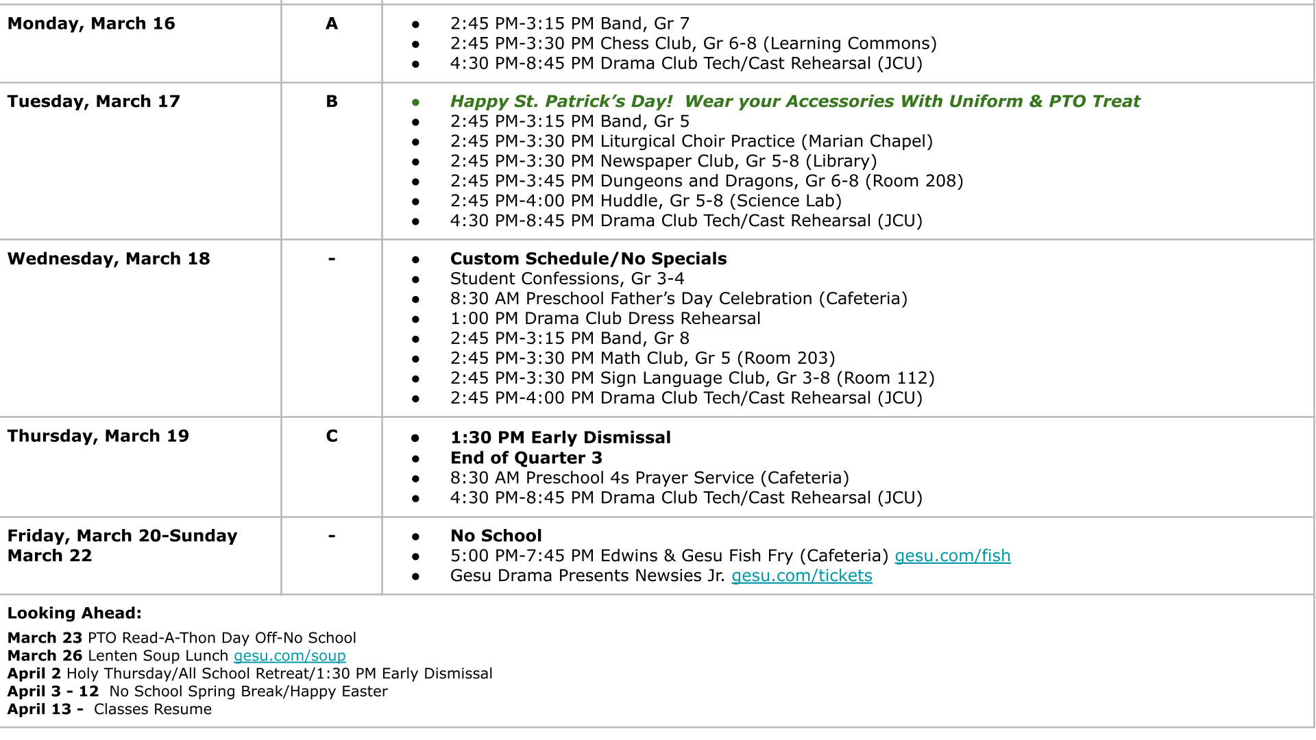 2026 Lenten Soup Lunch – Thursday, March 26 The Gesu Student Council will host our annual Lenten Soup Lunch on March 26. Students will be served chicken noodle soup, a roll, and water as a simple meal of sacrifice to support a charitable cause. No other lunch items will be available.