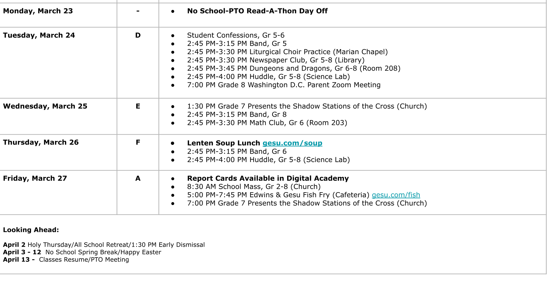 2026 Lenten Soup Lunch – Thursday, March 26 The Gesu Student Council will host our annual Lenten Soup Lunch on March 26. Students will be served chicken noodle soup, a roll, and water as a simple meal of sacrifice to support a charitable cause. No other lunch items will be available.