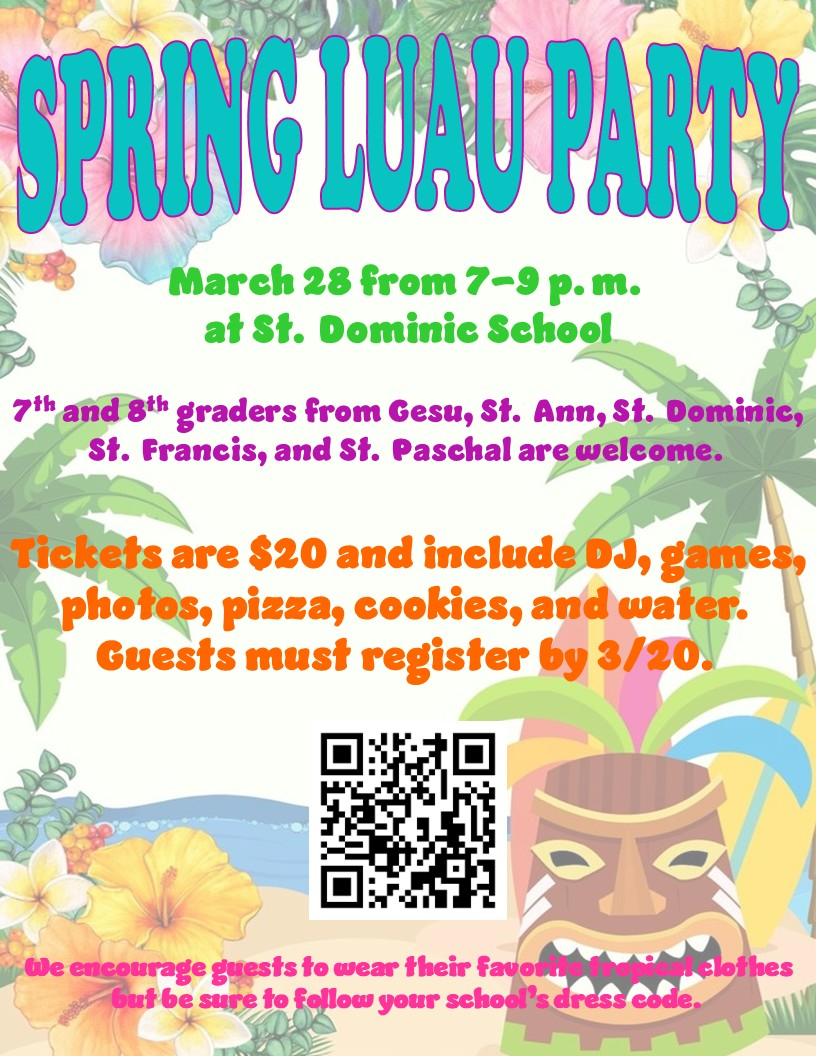 St. Dominic School Spring Luau Party for 7th and 8th graders on March 28. Students must register by 3/20. |