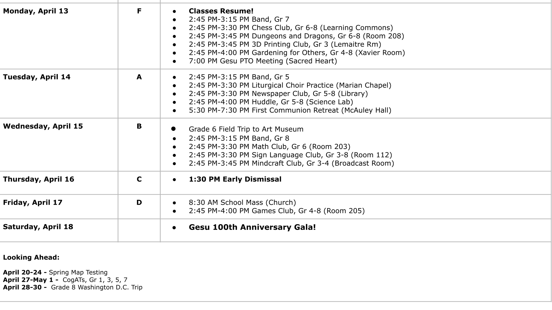 I hope this message finds you enjoying a safe and wonderful Easter Break! Take this time to rest, recharge and soak in the blessings of the season. Let us all return after this break refreshed and ready to continue to grow in knowledge, faith and love as we prepare for a strong finish to this school year!